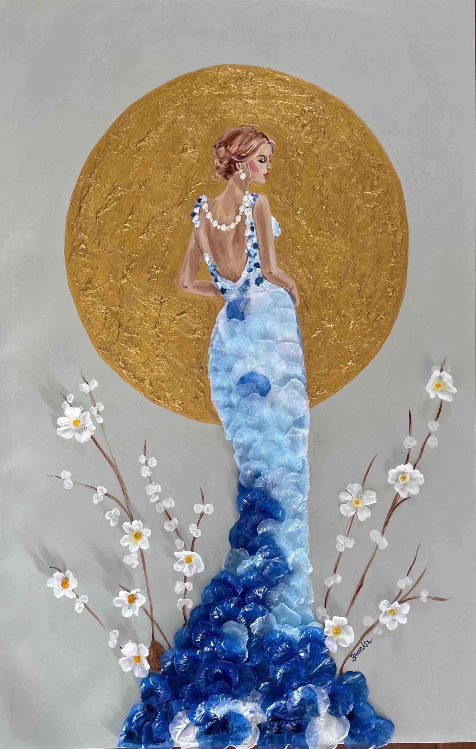 Original "Athena" is an acrylic and multimedia painting on a repurposed 35" x 23 1/2" canvas.